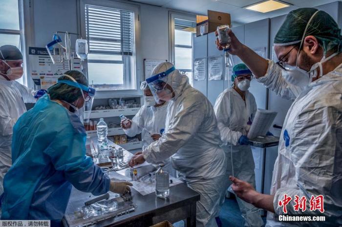 当地时间3月23日,探访意大利米兰东南部的克雷莫纳医院重症监护室,医护人员正在为感染新冠状肺炎的重症患者治疗。