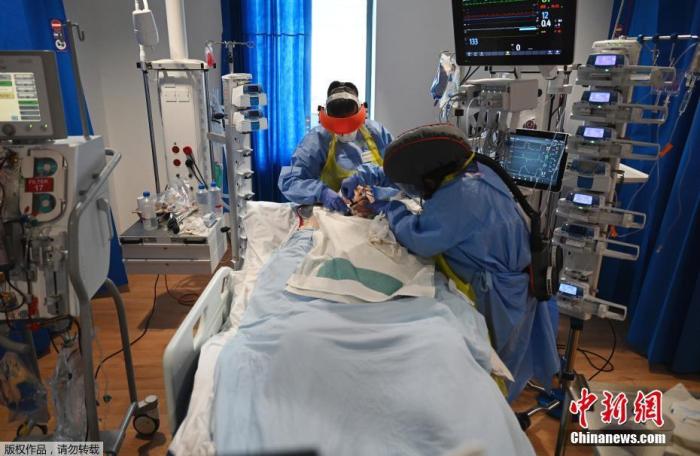 资料图:图为英国重症监护室内,医护人员在照顾新冠病毒感染者。